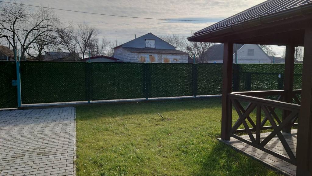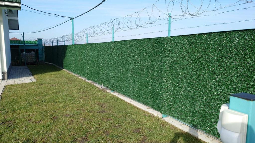У цьому проєкті зелена сітка змонтована на існуючу огорожу з використанням додаткових елементів надійного захисту. Таке рішення дозволяє поєднати функцію безпеки з охайним зовнішнім виглядом, приховуючи внутрішню територію від сторонніх поглядів.